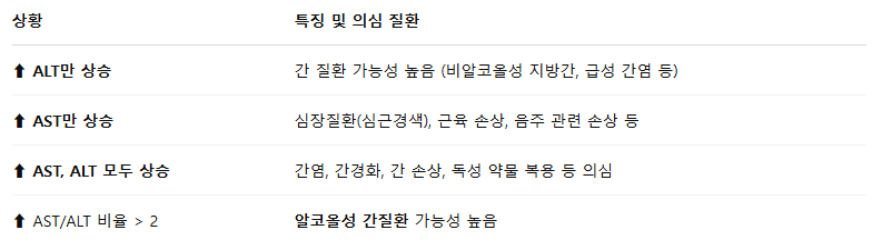 • ALT는 간 손상에 가장 민감한 지표이며, AST는 간 외 조직에도 영향을 받는 효소입니다.